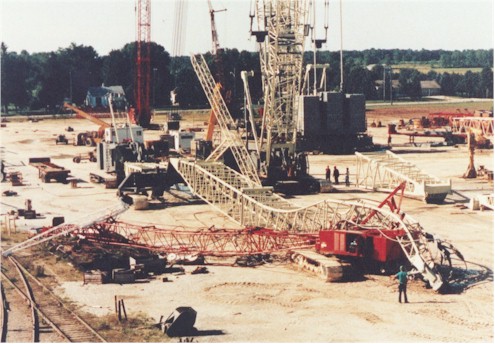 A wire-rope sling that was supporting a mast, which was being removed from a crane, broke causing the mast to fall to the ground as strike a second crane. Our investigation revealed that the mast was being removed from the crane by means of third crane. The white colored mast was attached to the load hook of the third crane with the wire rope sling. That hook was not equipped with a safety catch, so that the sling had to remain in tension or it could have slipped off the hook. The mast was rotated to a vertical position by means of the third crane. At that point the mast was extending vertically upward from a crawler of the crane being disassembled, and was being supported only by the sling and the third crane. The third crane then began to creep forward, when the sling broke and the mast toppled to the ground, striking the second (red colored) crane. The lifting capacity of the third crane was 300 tons (600,000 pounds) and the weight of the mast and crawler of the crane being disassembled was approximately 270,000 pounds. As a result, the third crane was capable of picking up the entire mast and crawler of the crane being disassembled. The sling was rated at approximately 80,000 pounds with a safety factor of 5, so that its breaking strength would have been approximately 400,000 pounds. However, a detailed examination of the sling revealed that it was not in good condition prior to the occurrence. The condition of the sling would have reduced its breaking strength. Consequently, as the mast was being moved, and was vertical, the load applied to that sling evidently exceeded its breaking strength, causing it to break and release the mast. |